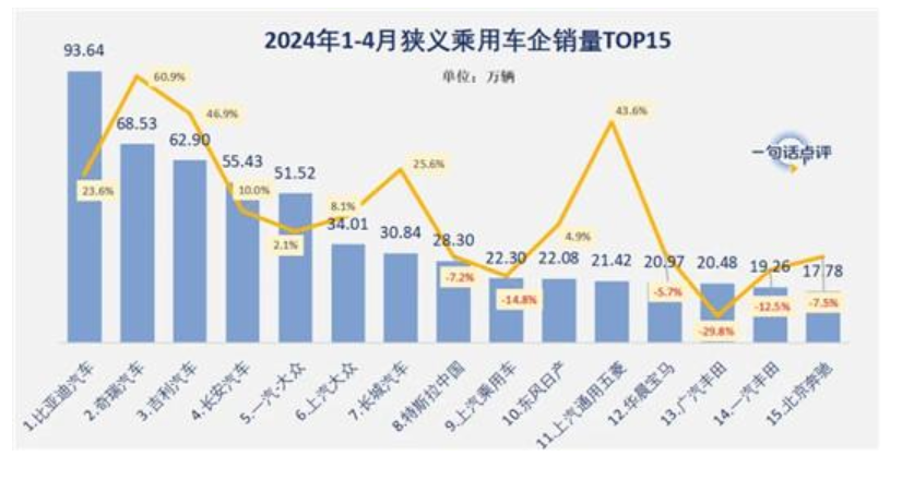 如果从今年前4月的情况来看,基本上全年的车企格局已经展现出来。比如比亚迪在短期两年内,基本上没有对手可以匹敌,奇瑞、吉利、长安追赶起来难度非常大。不过对比亚迪来说,累计同比23.6%的增幅也证明了“高处不胜寒”的道理,高速发展的阻力以及无数的追兵,要前进的每一步,都不会太轻松。