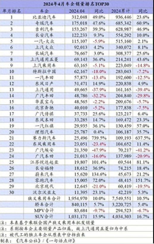 比如4月份,上汽通用和广汽丰田,基本上都挂上了三成左右的同比降幅,单月销量跌破5万辆以下,已经跌出了常规的车企十强。还有如广汽埃安,原本4万辆月销量的,但4月份跌落到2万辆的水平,同比下滑48%,增长稍显乏力。