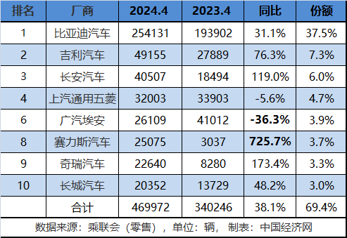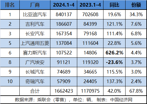 这一点在乘联会发布的新能源厂商零售销量TOP10排行榜中体现得更为明显。4月及前4月,传统品牌仍维持八席全自主名额,但所占市场份额比之上月则是分别提升2.2和0.3个百分点。