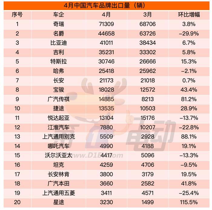 4月,奇瑞以7.1万辆的出口量,再夺冠军,这是继去年12月被名爵反超后,连续4个月稳居冠军宝座。名爵出口量环比大降30%至4.5万辆,而比亚迪出口量环比增长6.7%至4.1万辆,冲进前三,逼近名爵。