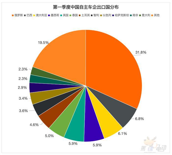 第一季度中国自主车企出口量达48.3万辆,遍地46个国家。其中,奇瑞、长城、吉利、长安、广汽、一汽集团出口俄罗斯市场,出口量达15.3万辆,占比最大达31.8%。