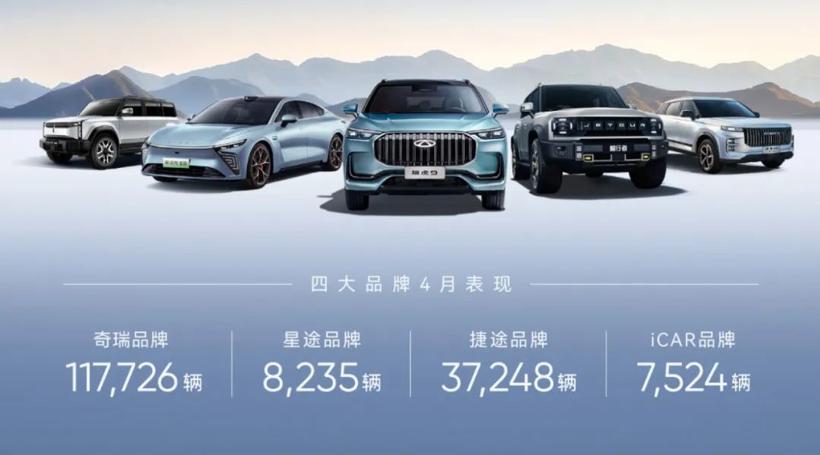 分品牌而言,奇瑞品牌4月销量117,726辆,1-4月销量482,947辆,同比增长57.5%;星途品牌4月销量8,235辆,1-4月份销量31,728辆,同比增长28%;捷途品牌4月销量37,248辆,1-4月销量144,724辆,同比增长104%;iCAR品牌的首款产品iCAR 03该月份销量7,524辆,累计销量13,011辆。