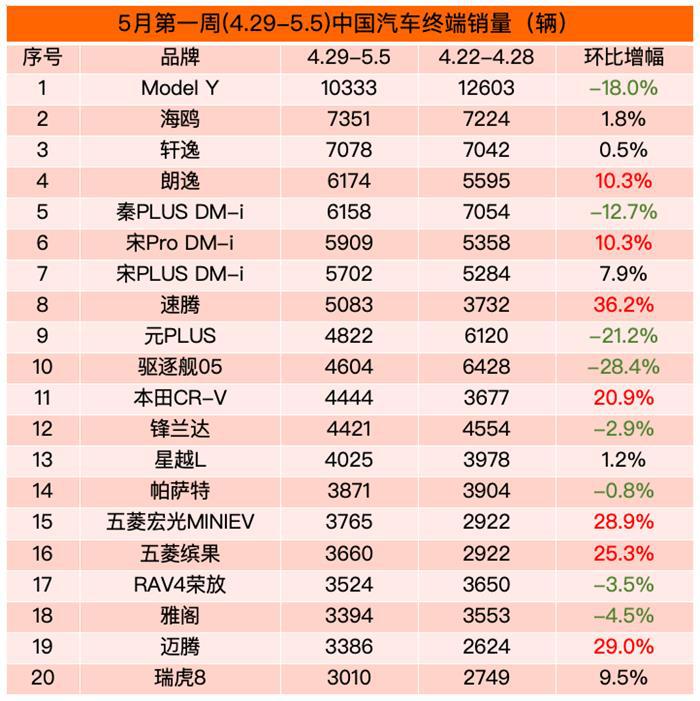 与4月第四周(4.22-4.28)相比,五一假期(4.29-5.5)TOP20汽车品牌终端总销量环比下滑12.3%,TOP20车型终端总销量环比下滑0.3%。