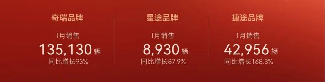 奇瑞集团旗下自主乘用车品牌均实现同比增长。其中,奇瑞品牌1月份销量135130辆,同比增长93%;星途品牌1月份销量8930辆,同比增长87.9%;捷途品牌1月份销量42956辆,同比增长168.3%。