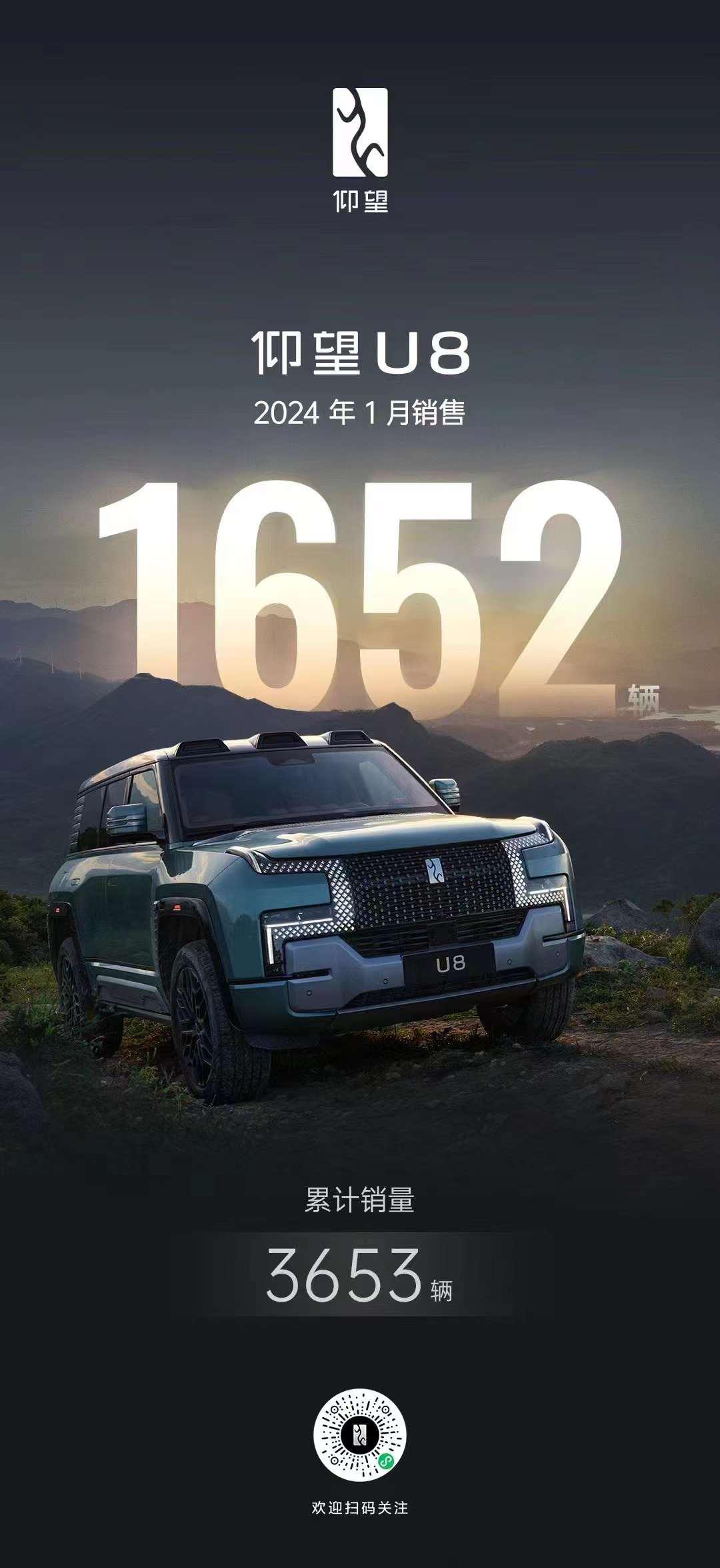 2月2日,比亚迪旗下高端品牌仰望宣布,其首款车型仰望U8今年1月销量为1652辆,上市累计销量3653辆。