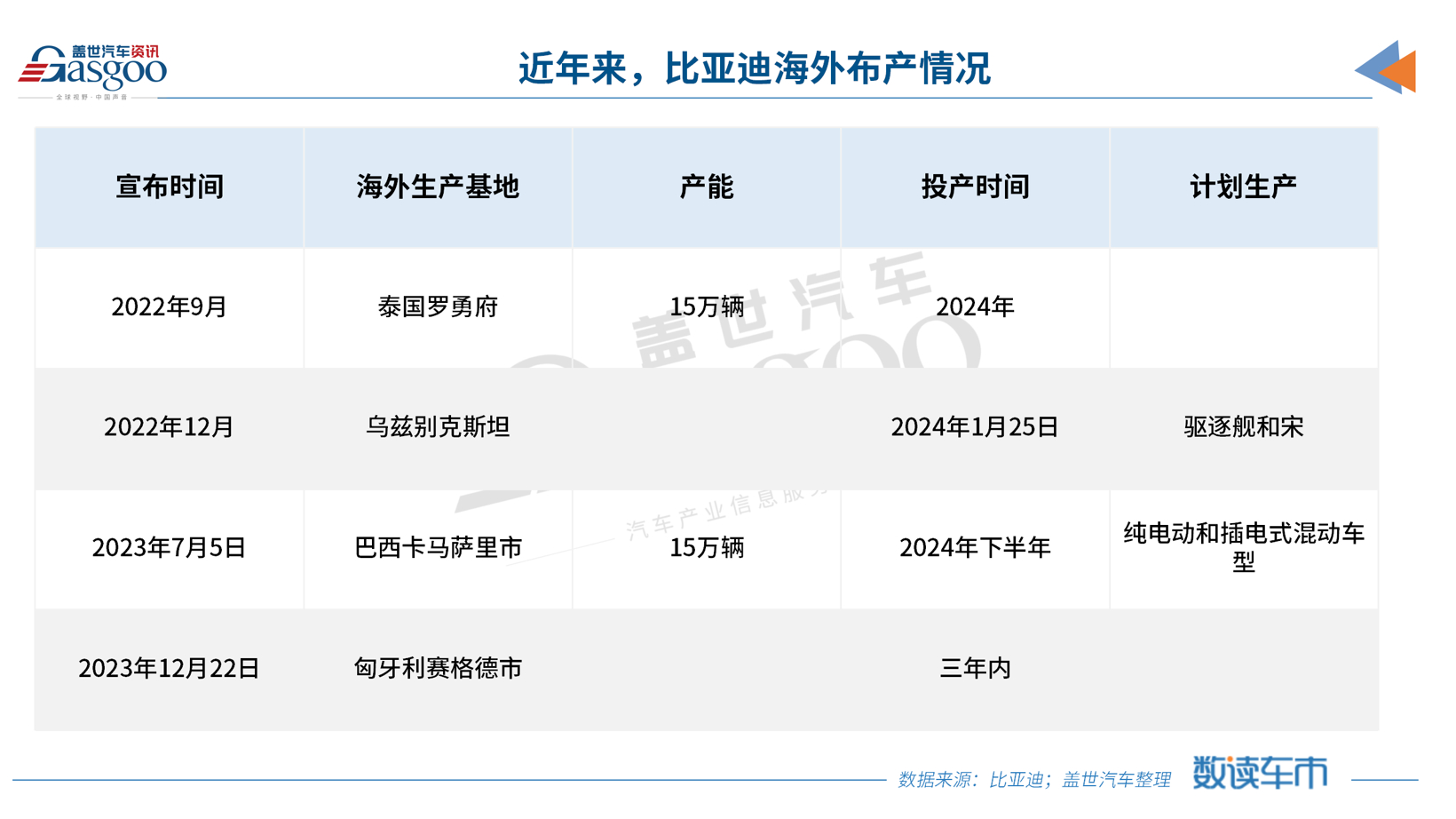 伴随海外市场的热销,比亚迪自2022年下半年起便加速海外布局,至今已完成在东南亚泰国、中亚乌兹别克斯坦、南美洲巴西以及东欧匈牙利海外生产基地的布局。