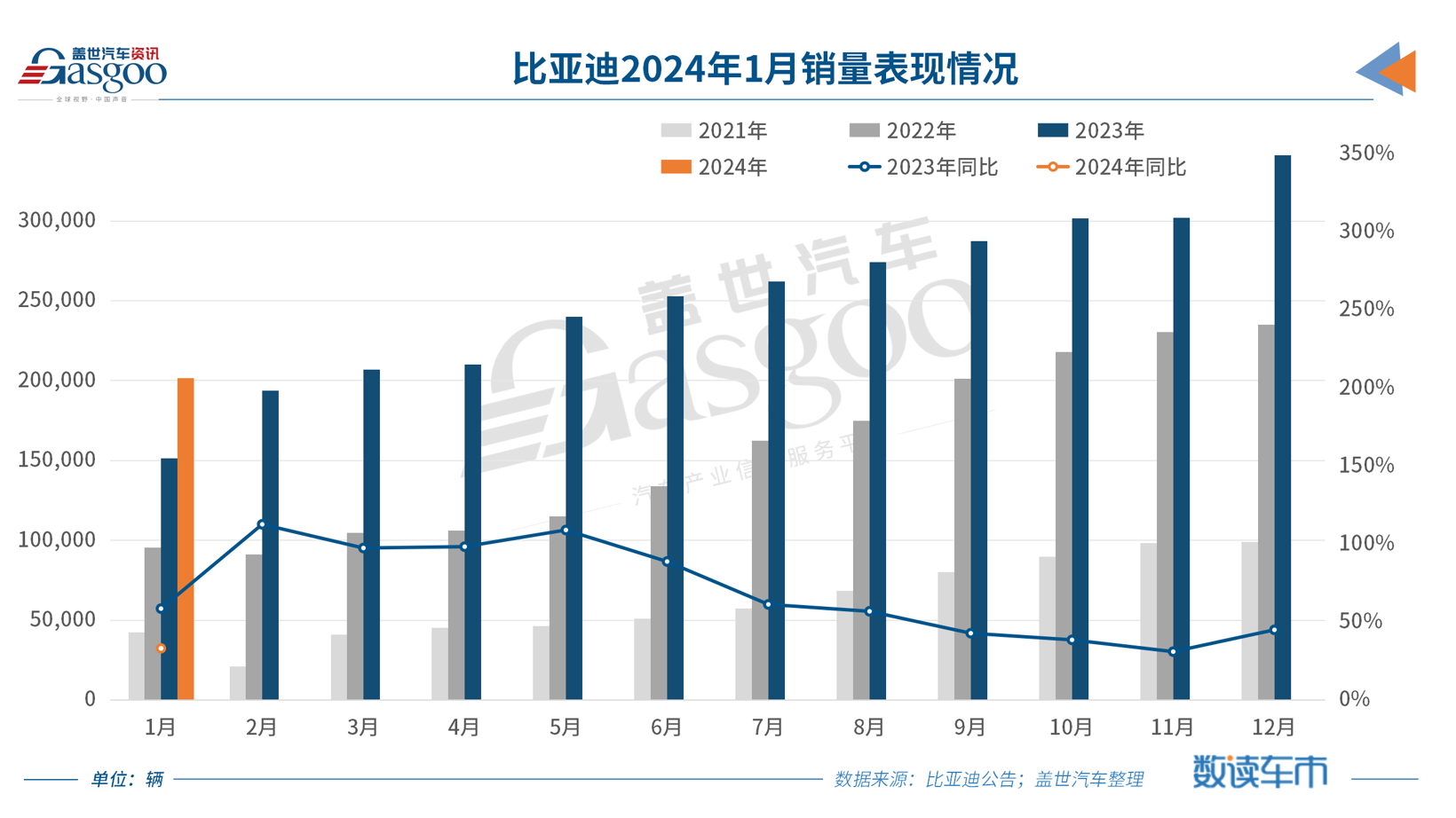 面对市场承压,比亚迪在1月实现销售201,493 辆新能源汽车,较去年同期增长33%。其中共计销售201,019辆新能源乘用车,同比增长34%,更刷新了历年同月最高销量成绩。