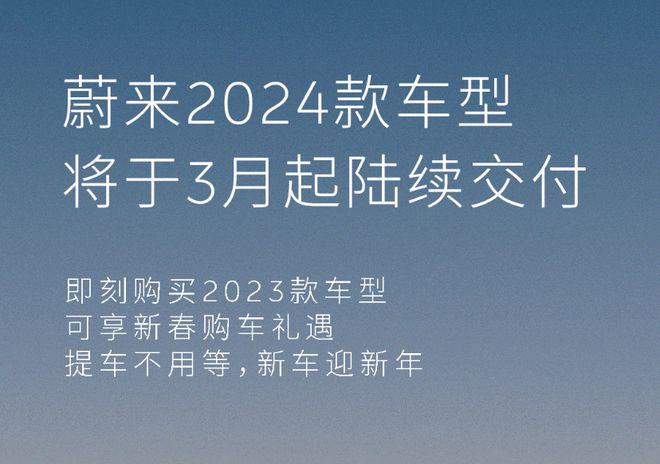 另外,蔚来2024款车型将于3月上旬陆续开启交付,蔚来将在本月为用户提供2023款车型短时购车优惠,据悉优惠力度不等,在2.4-3.2万元区间。