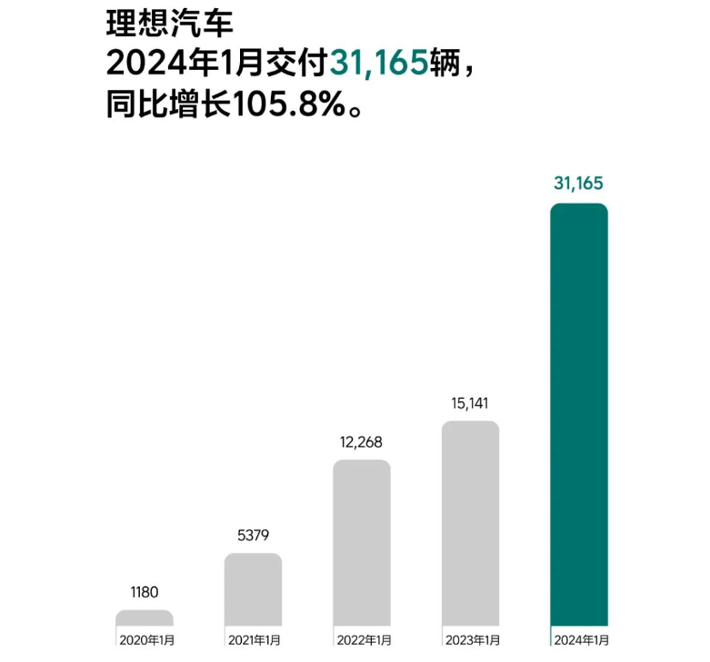2024年1月,理想汽车共计交付新车31,165辆,同比增长105.8%。自交付以来,理想汽车累计交付量达到664,529辆。