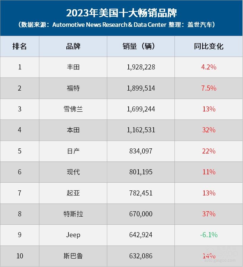 得益于在美国市场连续八个月的增长,丰田品牌2023年在美国市场的销量约为192.8万辆,同比增长4.2%,而福特品牌在美国的销量约为189.95万辆,同比增长7.5%,排名仅次于丰田品牌。