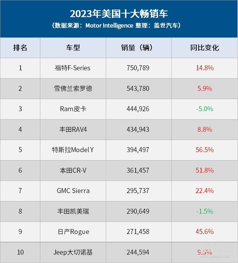 根据Automotive News Data Center和Motor Intelligence发布的数据,2023年,丰田依然是美国汽车市场最畅销品牌,福特F-Series也依然是美国最畅销的车型。