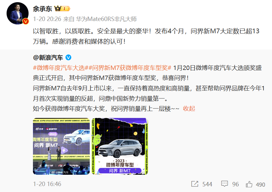 1月20日,华为汽车BU董事长余承东透露,上市4个月,问界新M7大定数已经突破13万台。