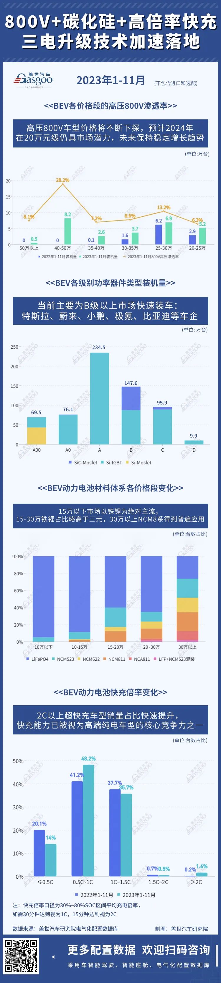 当前从2023年1-11月新能源乘用车电气化配置装机量来看,800V车型的渗透率4%左右,SiC渗透率达到10%左右,其中主要为比亚迪、腾势、蔚来、小鹏、极氪、阿维塔、昊铂等品牌车型,近期国内外多家车企均发布了旗下800V平台新车,并且大多数车型集中于2024年初上市,随着高压800V超充产业链逐渐成熟,成本进一步下探,2024年有望加速下探到20万以内,进一步实现800V技术的普及和向主流市场渗透;