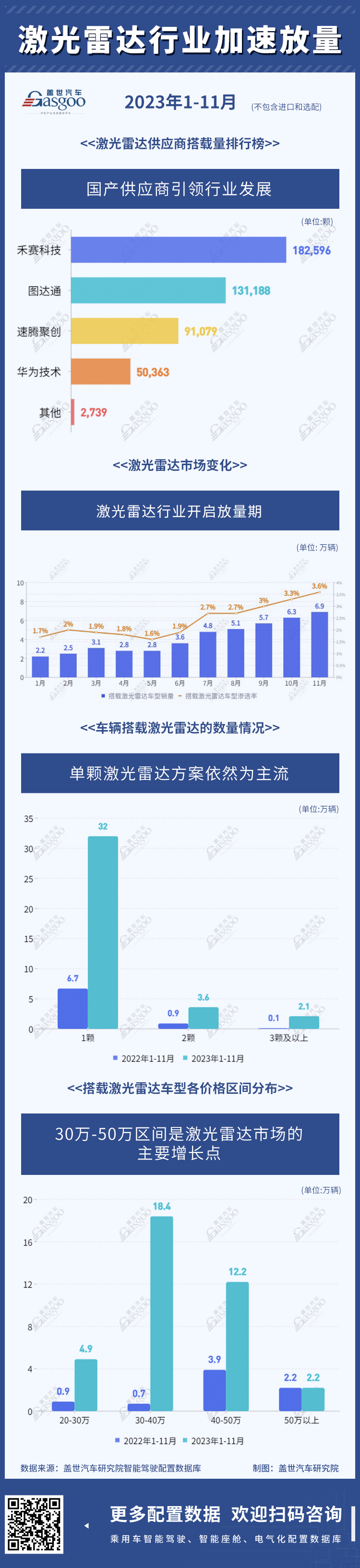 2023年激光雷达开启了“放量”元年,自7月以来显示出了快速增长的趋势,这背后的原因包括多传感器融合的高阶智驾方案盛行,也包括国内激光雷达企业的成功降本。目前,搭载有激光雷达的车辆依然以单颗方案为主,两颗的激光雷达的方案有进一步增长的趋势。30-50万元依旧是激光雷达市场的主要增长点,在明年会有更多车型下探到30万元以下区间,激光雷达的装车量会进一步上升。