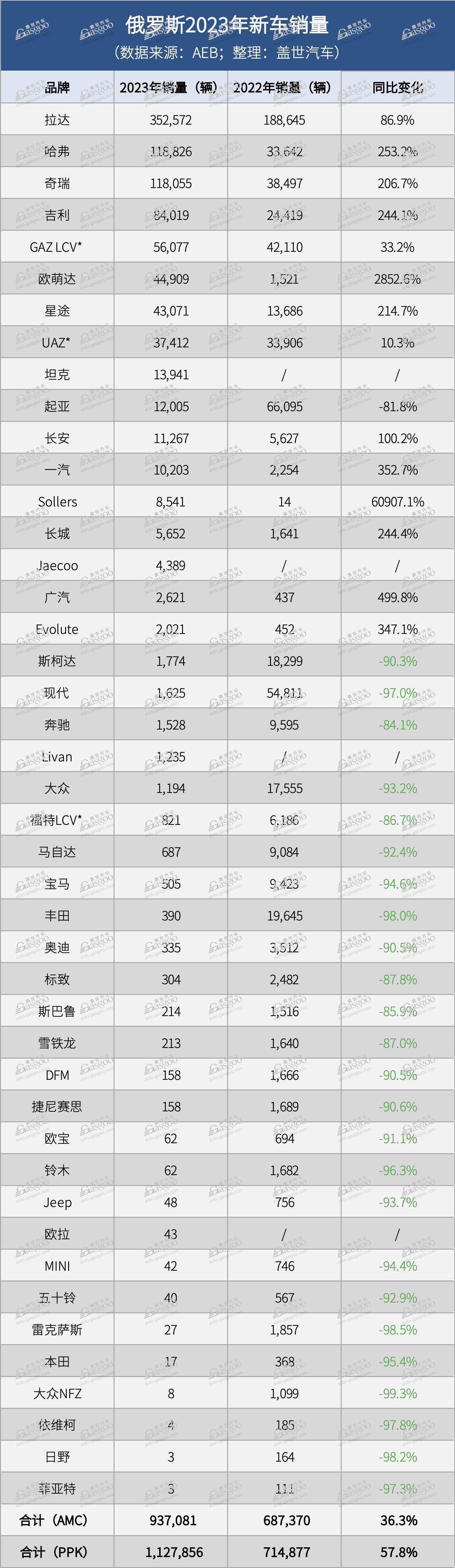 为了更客观地评估俄罗斯新车市场的状况和动态,AEB从去年7月份开始补充PPC JSC(Passport industrial consulting)提供的销量数据(基于向车主交车的数据,包括部分AEB未统计到的数据)。根据PPC JSC的数据,去年12月份,俄罗斯的新车销量同比大涨84.6%至128,930辆;2023年全年,俄罗斯的新车销量为1,127,856辆,同比涨幅为57.8%。不过,2023年全年新车销量依然低于俄乌局势升级之前的水平。