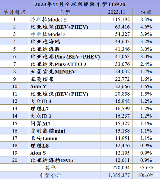 11月的猛冲让海鸥的累计销量突破20万辆大关,第一次闯入累计榜单前十。海鸥的加入,让2023年全球新能源车型十强中比亚迪产品的数量有望增加至6款。