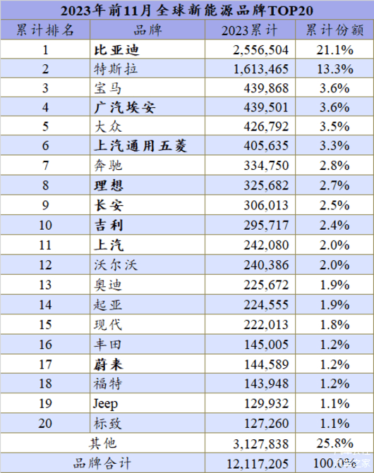 转眼已经进入2024年,比亚迪和和特斯拉也已相继发布2023年各自的全球销量,分别为301.3万辆(仅含乘用车)和181万辆,但由于统计国家数量较多、所需时间长,近日2023年11月和前11月全球新能源市场的数据才出炉。
