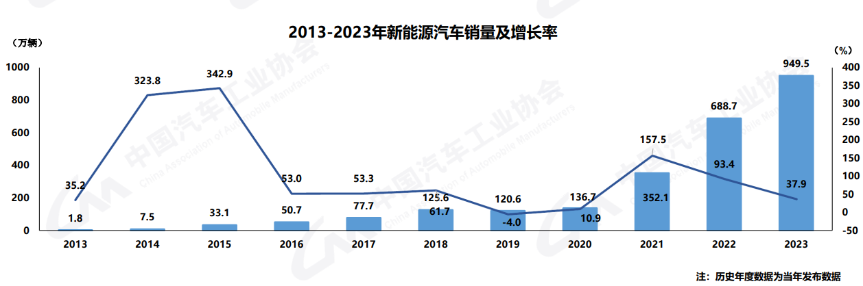 2023年,在政策和市场的双重作用下,我国新能源汽车持续快速增长,新能源汽车产销分别完成958.7万辆和949.5万辆,同比分别增长35.8% 和37.9%,市场占有率达到31.6%,高于上年同期5.9个百分点。其中,新能源商用车产销分别占商用车产销11.5%和11.1%;新能源乘用车产销分别占乘用车产销的34.9%和34.7% 。