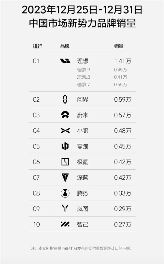 2024年第一周,新势力销冠易主。据理想汽车官方发布的数据显示,问界汽车周销量达0.59万,首次超越理想汽车。