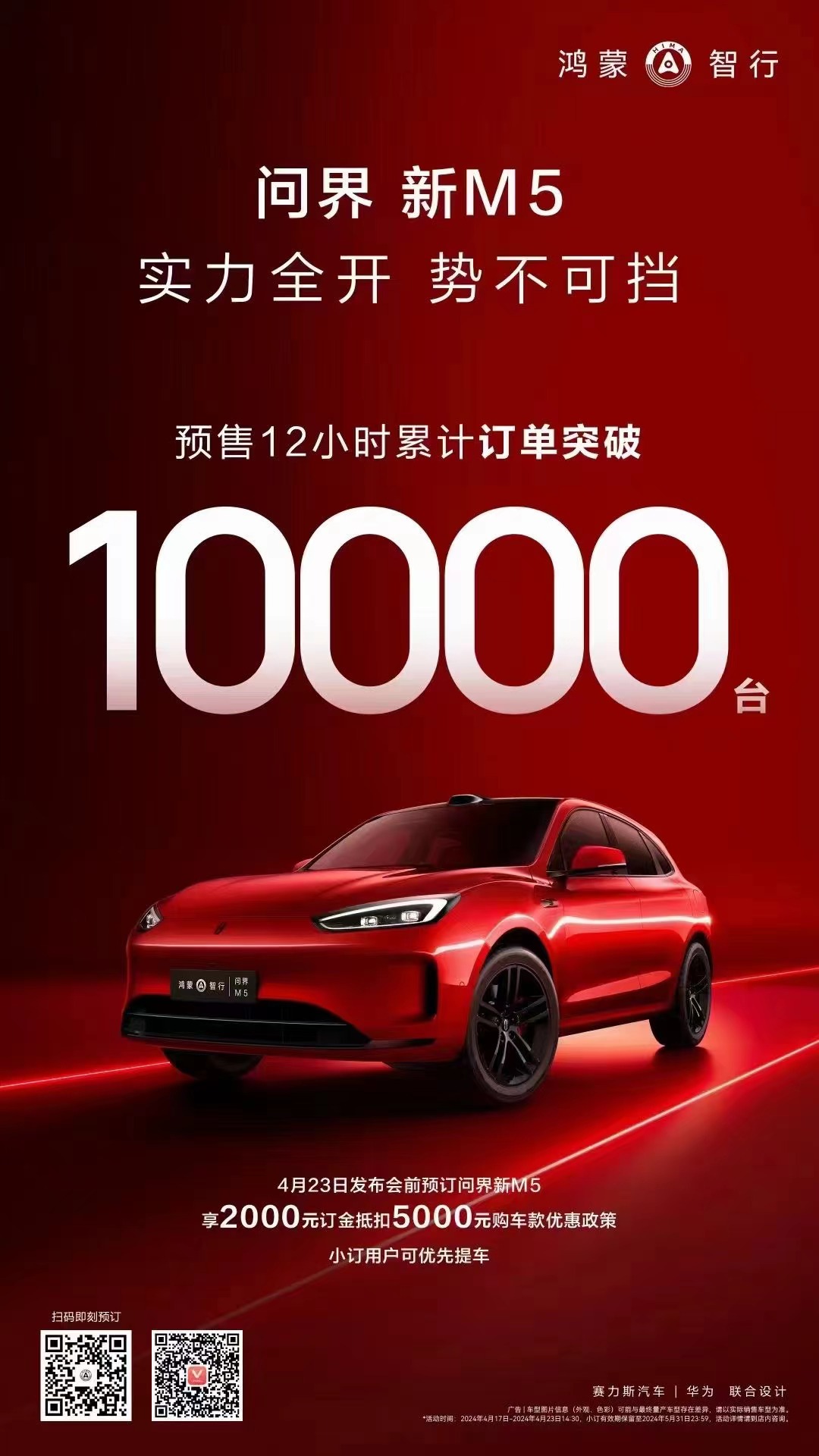 4月17日,鸿蒙智行官方宣布,问界新M5开启预售。而后在该日晚间,其公布预售成绩单:预售仅12小时,问界新M5累计订单就已突破10000台。