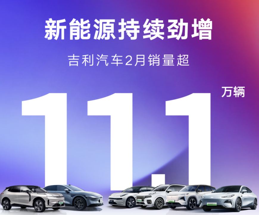 3月1日晚,吉利汽车发布最新销量数据显示,2月共计销售新车111398辆,同比增长超3%;其中新能源汽车销量达33508辆,同比劲增约48%,市场渗透率超过30%。