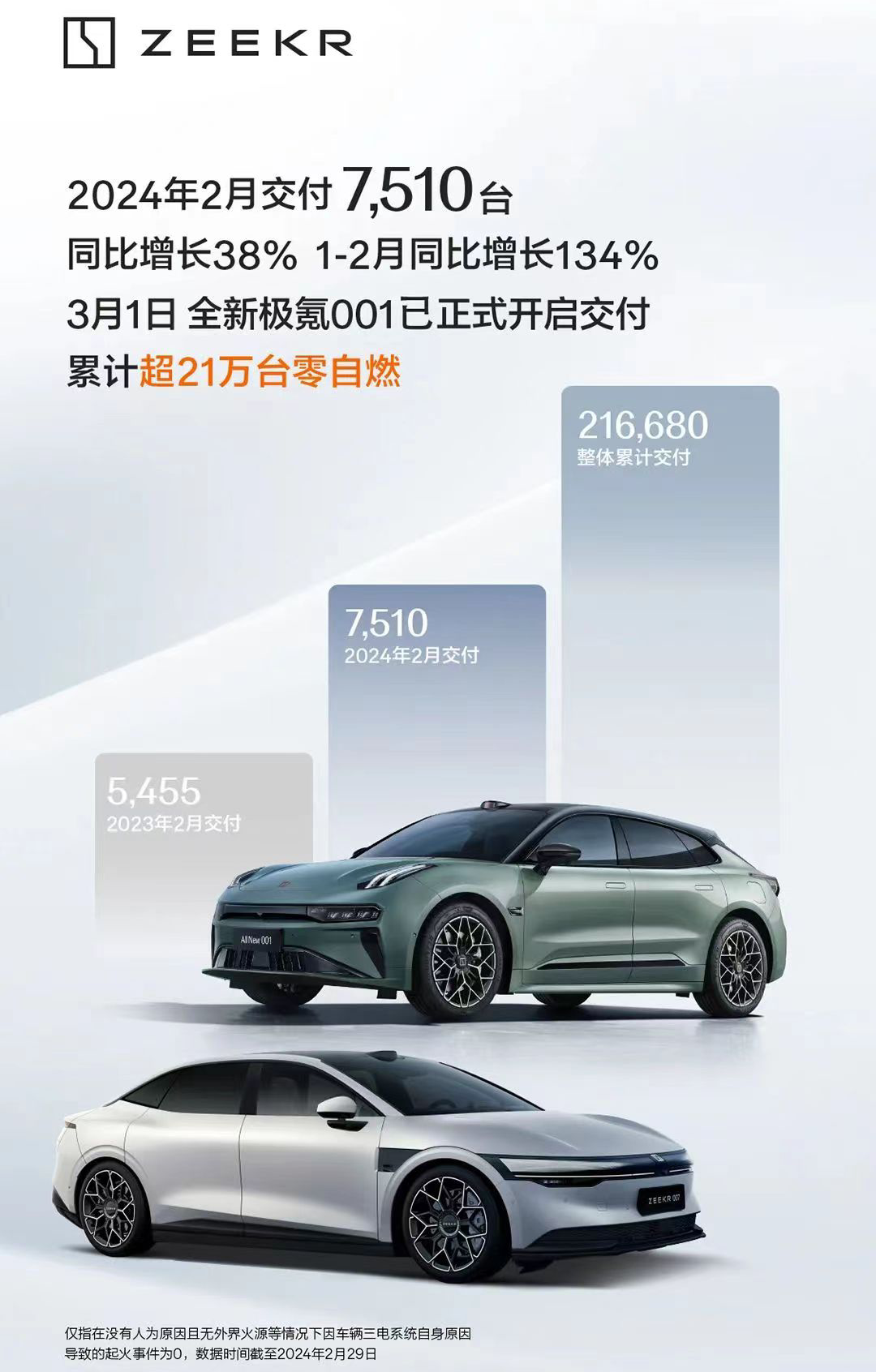 极氪品牌2月交付量7510辆,同比增长38%;1-2月共交付20047辆,同比增长134%。可以看出,极氪品牌的单月交付量还是较为稳定的。目前,极氪已有001、X、009、007四款车型在售,覆盖轿车、SUV和MPV三大市场。