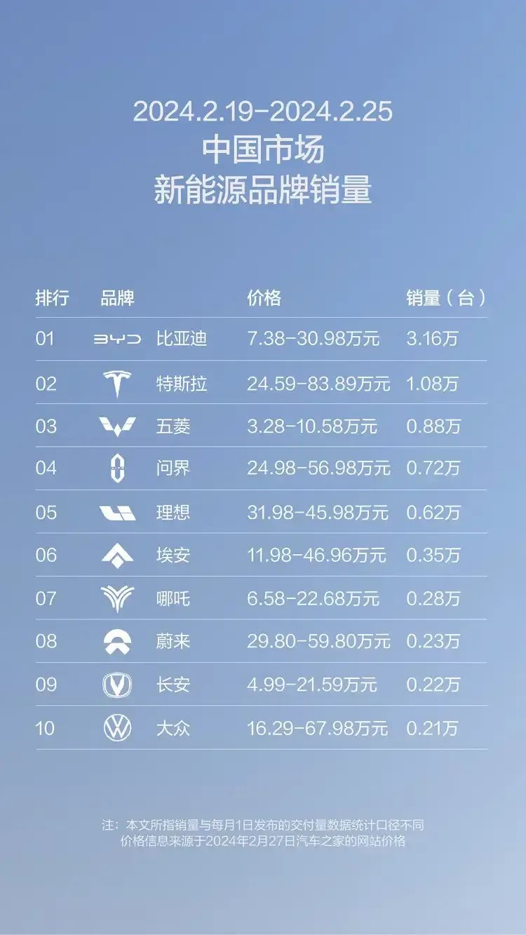 2月28日,五菱品牌公布第四周新能源销量,为8765辆,位列二月第四周中国市场新能源品牌销量第三名,前两名为比亚迪和特斯拉。
