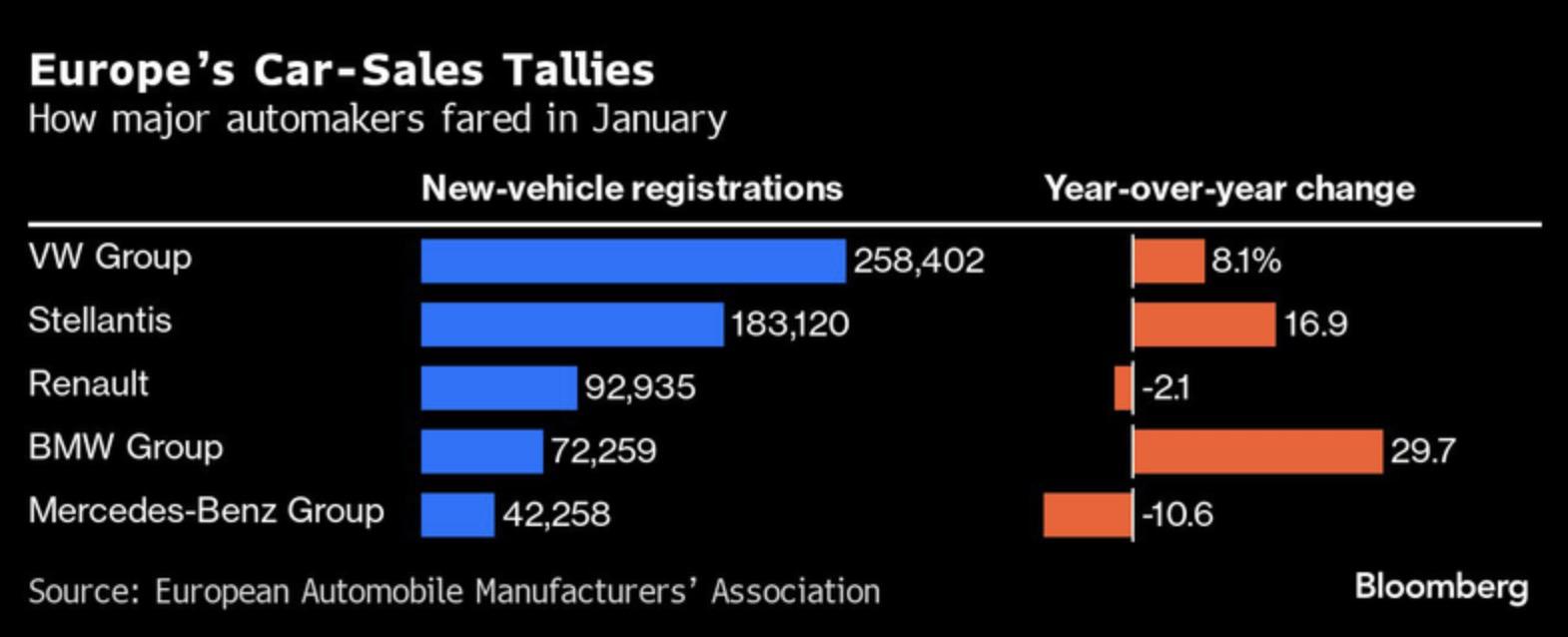 大众、Stellantis、雷诺、宝马和奔驰欧洲销量及同比变化 图片来源:彭博社