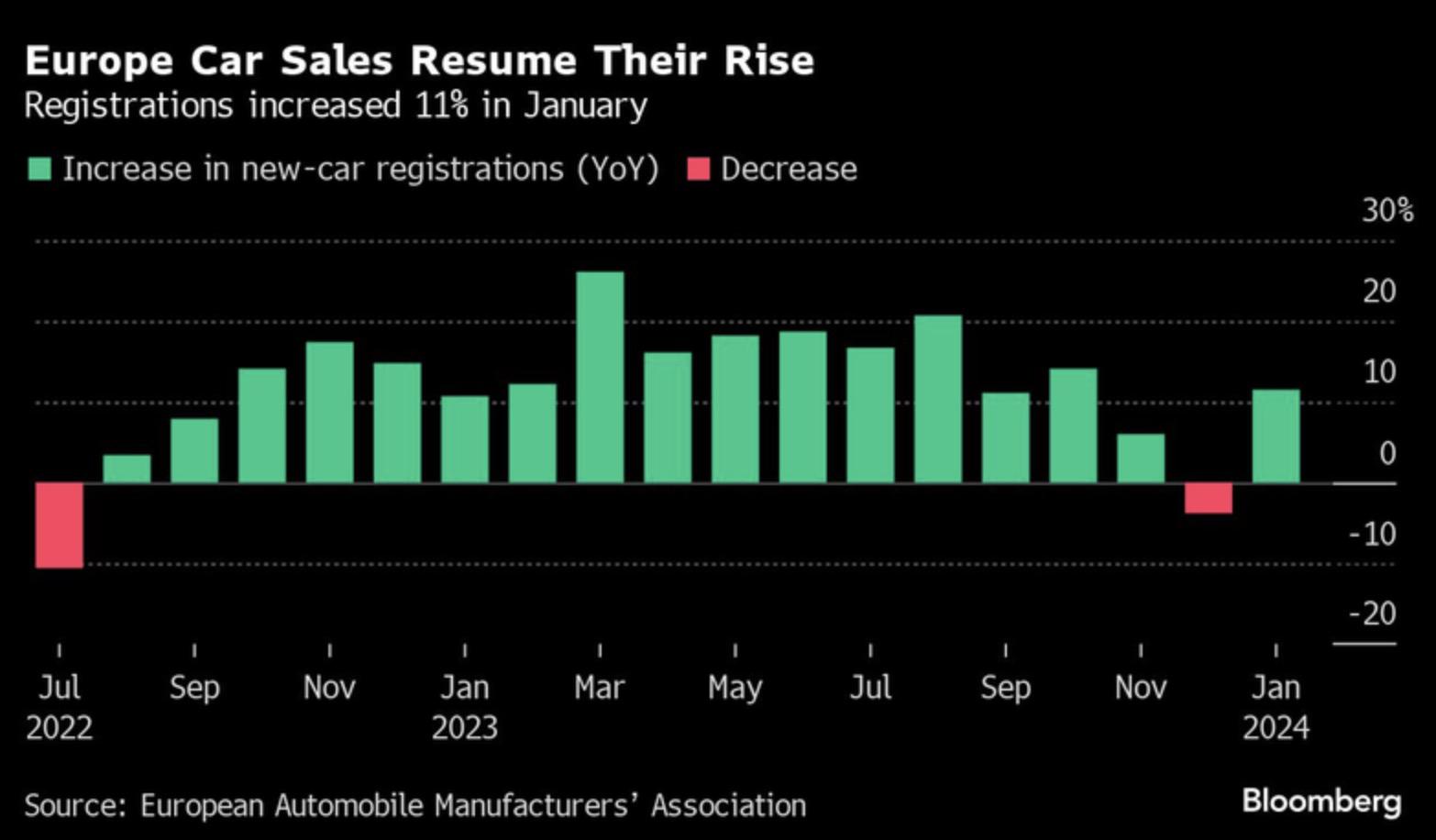 欧洲新车销量和同比变化图 图片来源:彭博社