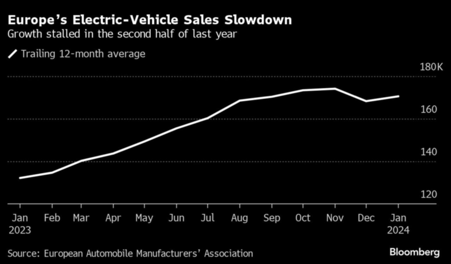 欧洲纯电动汽车销量放缓 图片来源:彭博社