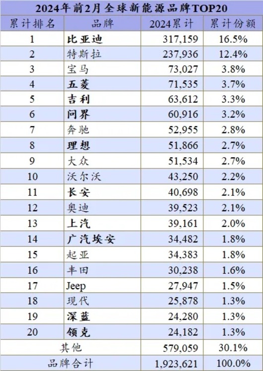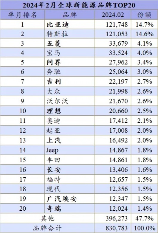 再从品牌榜单来看,受到春节假期的影响,2月比亚迪销量大幅“缩水”,但它仍以695辆的优势领先特斯拉,继续蝉联全球新能源市场的品牌冠军。