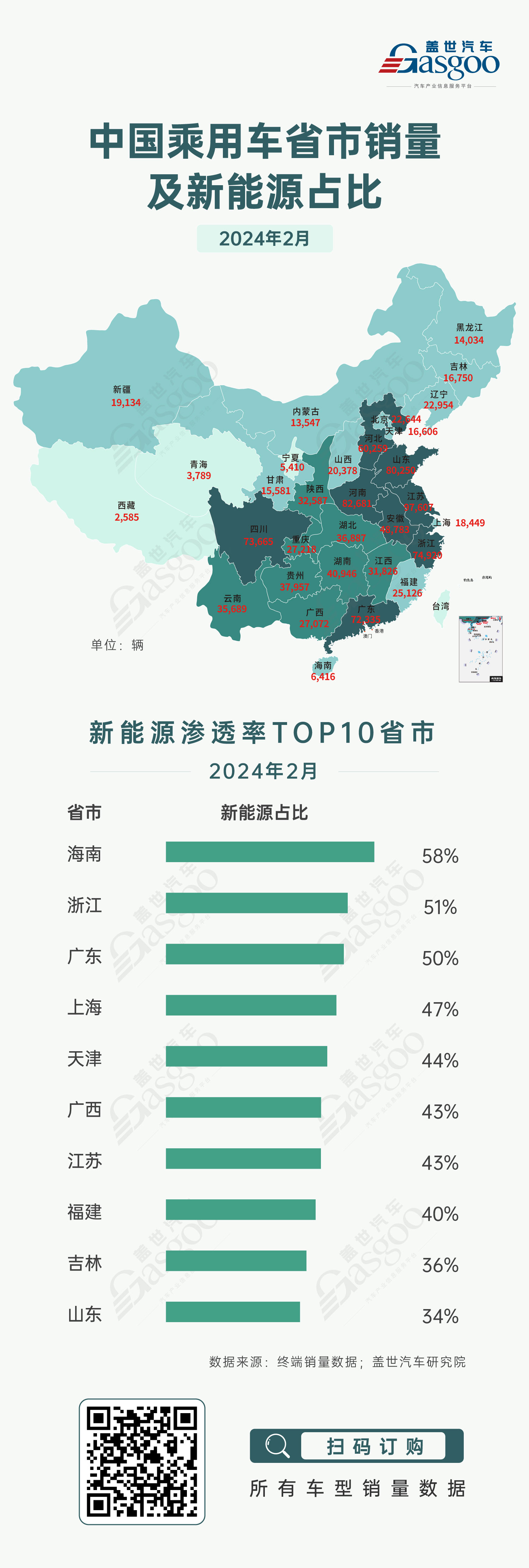 从中国乘用车各省市销量来看,江苏、河南、广东、浙江等地区排在前列,分别为97,607辆、82,681辆、72,335辆、74,920辆。在新能源渗透率方面,海南、浙江、广东等省份的新能源占比超过了50%,这表明这些地区的新能源汽车市场已经较为成熟,新能源汽车已经成为了消费者购车的重要选择。同时,这些地区也在积极推动新能源汽车相关产业的发展,形成了较为完善的产业链。(了解更多中国乘用车各省市销量及新能源占比,欢迎查看盖亚系统)
