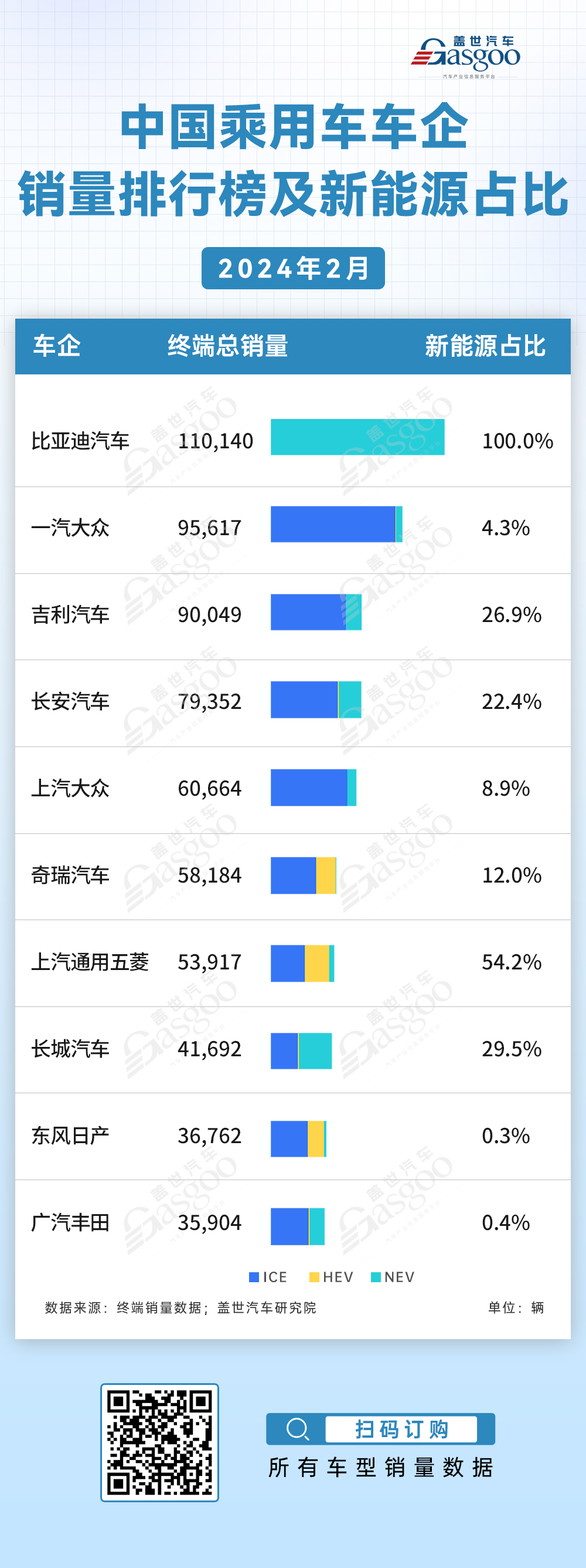 2024年2月,中国乘用车车企销量排行榜中,比亚迪汽车以110,140辆的销量以及100%的新能源占比位居榜首,展现出了强大的市场竞争力。销量上紧随其后的是一汽大众、吉利汽车和长安汽车等车企,一汽大众虽然销量达到了95,617辆,但新能源占比仅有4.3%。这些车企在传统燃油车市场的销量依然稳健,但新能源汽车市场的快速崛起也对它们提出了新的挑战。除了比亚迪汽车外,其他车企也在新能源汽车市场取得了不俗的成绩。吉利汽车、上汽通用五菱、长城汽车等车企的新能源汽车销量占比均超过了20%,显示出这些车企在新能源汽车领域的积极布局和持续努力。(查询更多乘用车终端销量,欢迎查看盖亚系统)